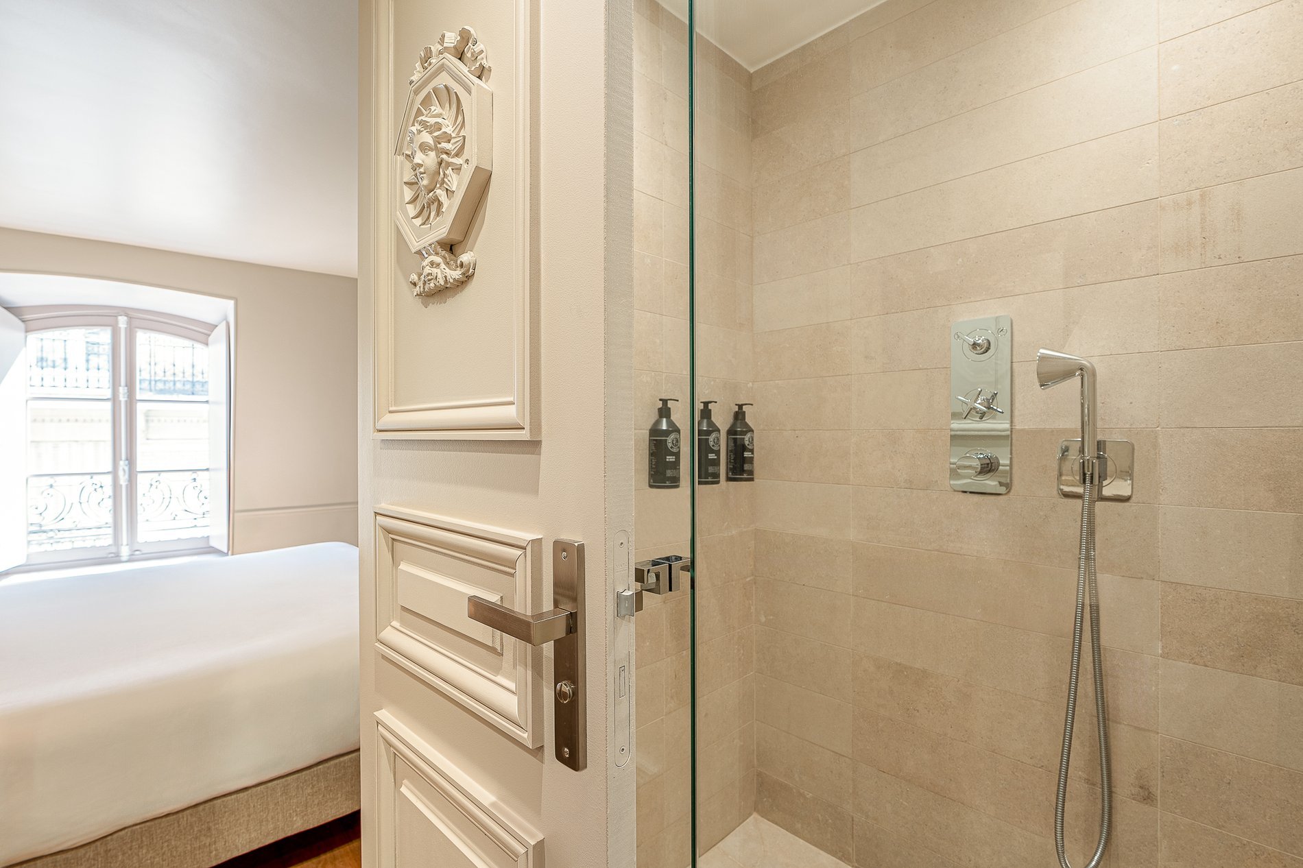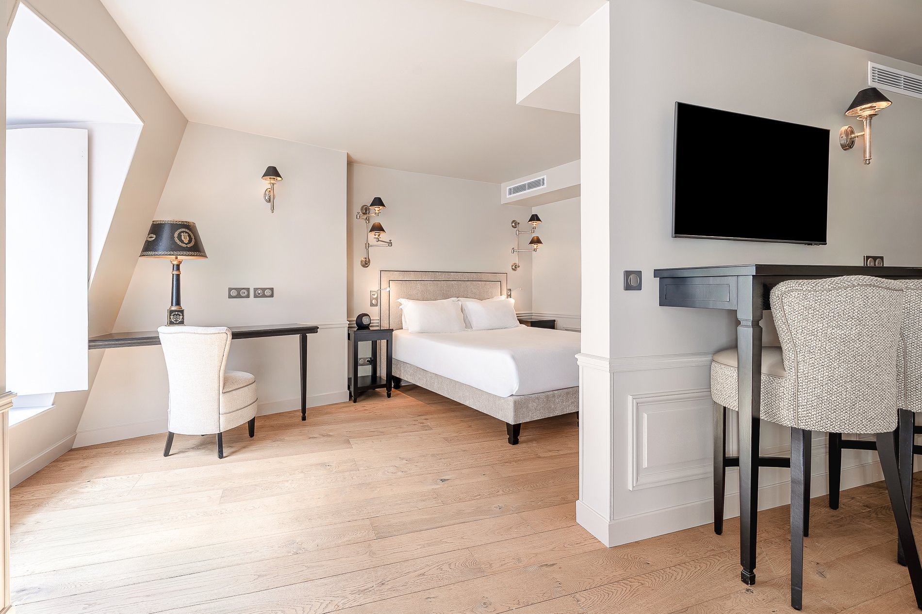 Récemment rénovée, spacieuse et baignée de lumière, la Junior Suite marie avec élégance le charme classique parisien à des lignes résolument contemporaines. Son agencement généreux offre un coin chambre avec un lit Queen-Size (double ou twin) ainsi qu’un coin salon avec canapé-lit et kitchenette. La salle de bain est équipée d'une double douche à l'italienne. Cette chambre peut accueillir jusqu’à 4, parfaite pour un séjour en couple ou en famille.