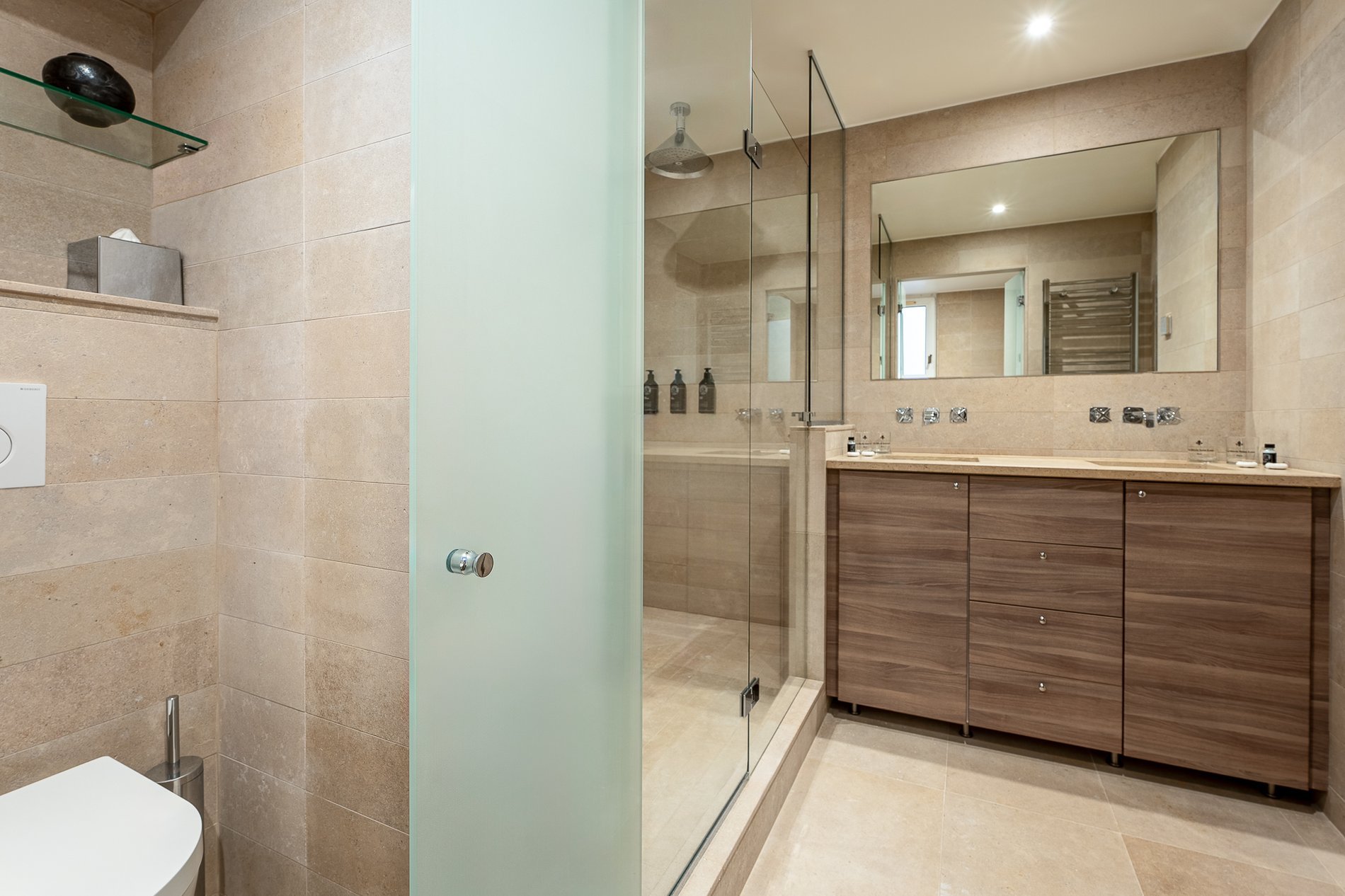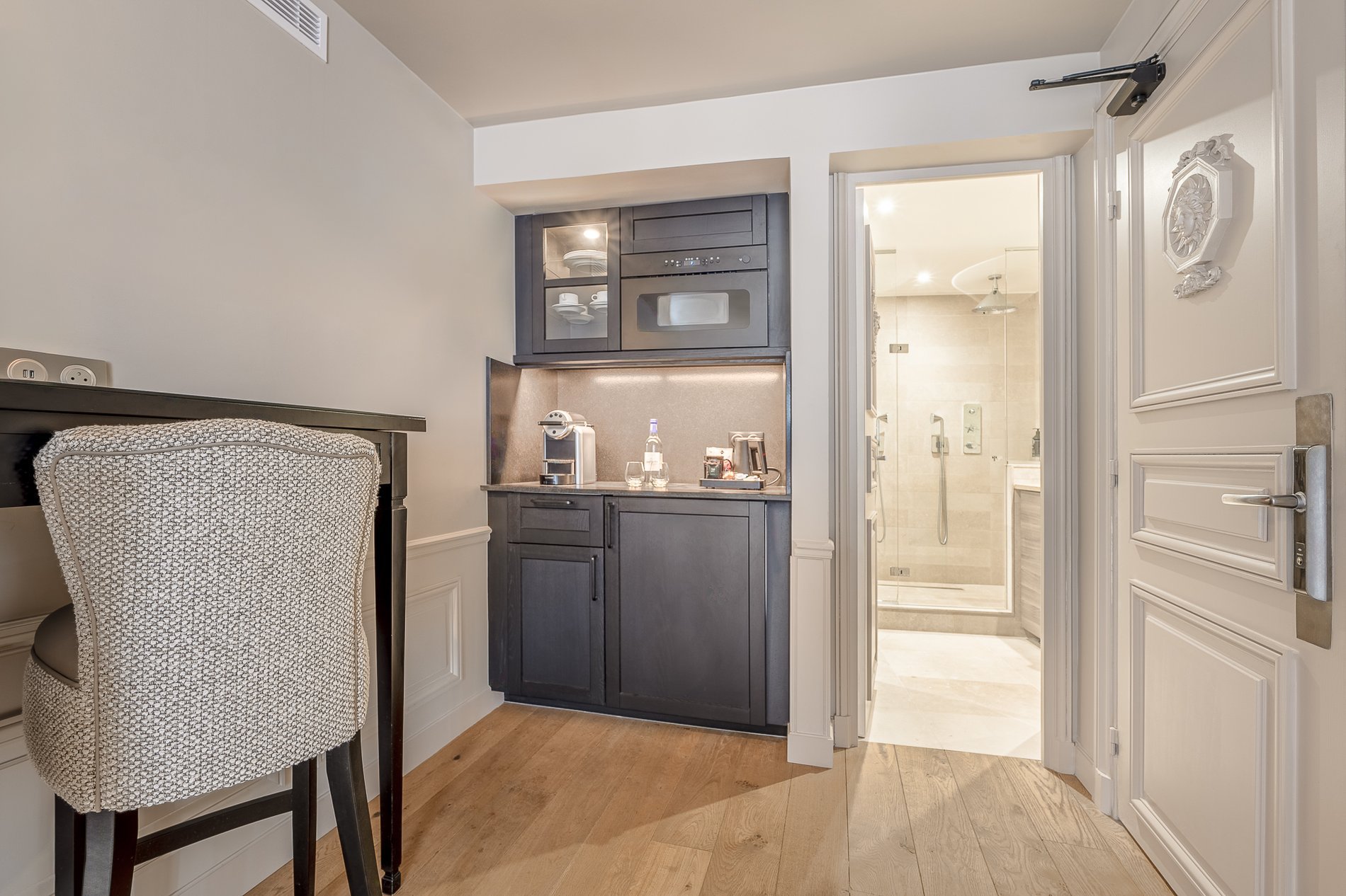 Chaque espace a été pensé comme un écrin de douceur, mêlant matériaux nobles, éclairage raffiné et détails sur mesure. Le parquet clair, les boiseries délicates et les tissus aux teintes naturelles composent une atmosphère apaisante et élégante, propice à la détente.